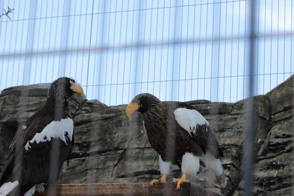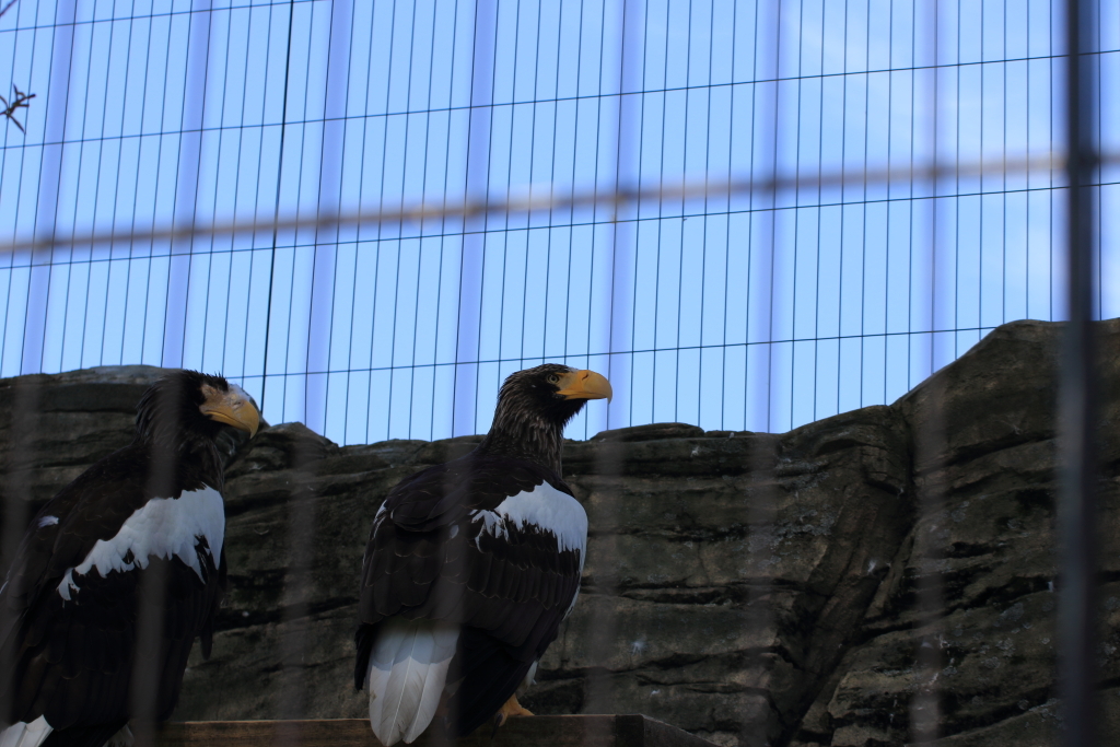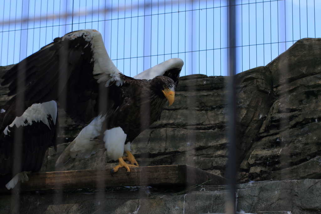 もう1回戻って来ちった。あれ柵ボケて見えなくなってる。デジイチならピントをマニュアルで操作することである程度柵が写り込まないようにもできるのか。いやそれにしてもかっこいい。都会にいることもありシティーナイズされ野性味はスポイルされてるかもしれないが、通る人々からかっこいい言われまっくてますやん。いつか絶対飛翔姿撮る!!そんな感じで意気揚々とパンダブースへ向かう中、ツレが一言