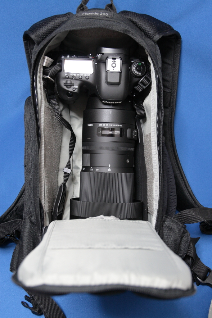 7D2及びsigma150-600Cを極力コンパクトに持ち運ぶべく内寸などを吟味し、ヨドバシの実店舗で実際に突っ込んでみてから(全て店の展示品)購入した『ロープロ フリップサイド 200(廃版)』。生産終了品なので、150-600C購入する半年以上前、2015/10月に購入しました。