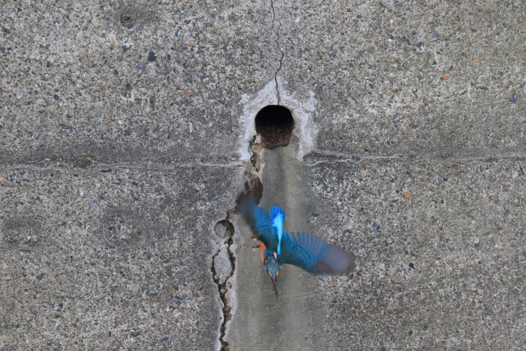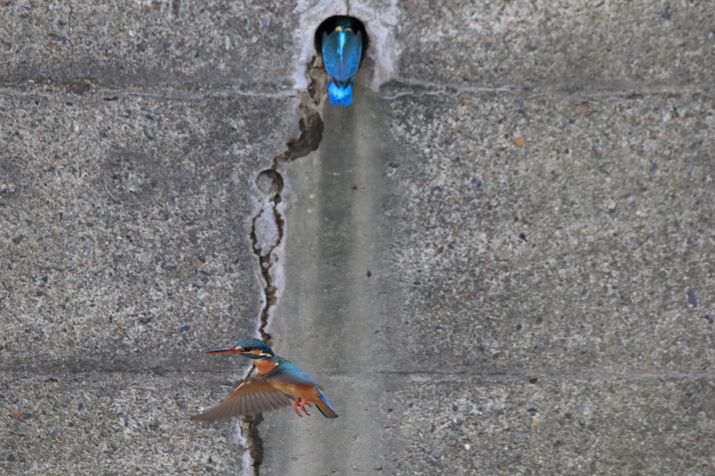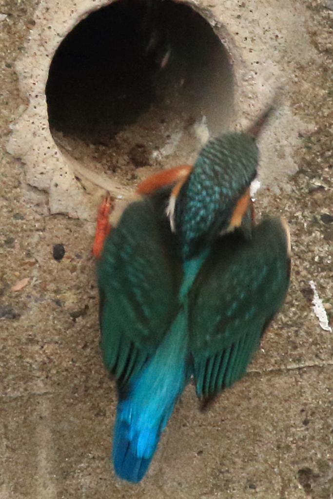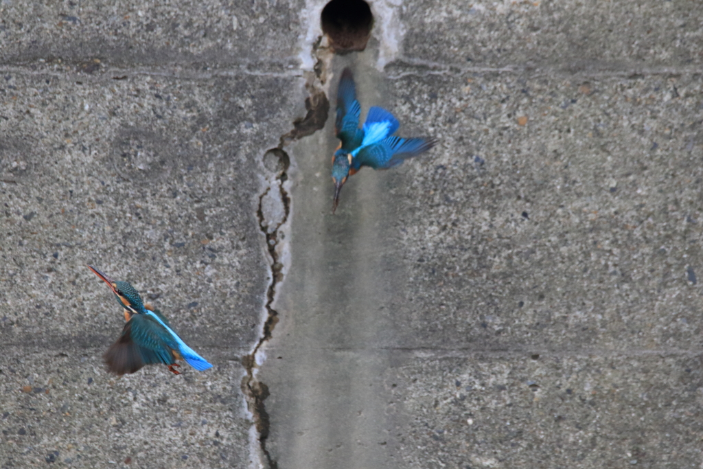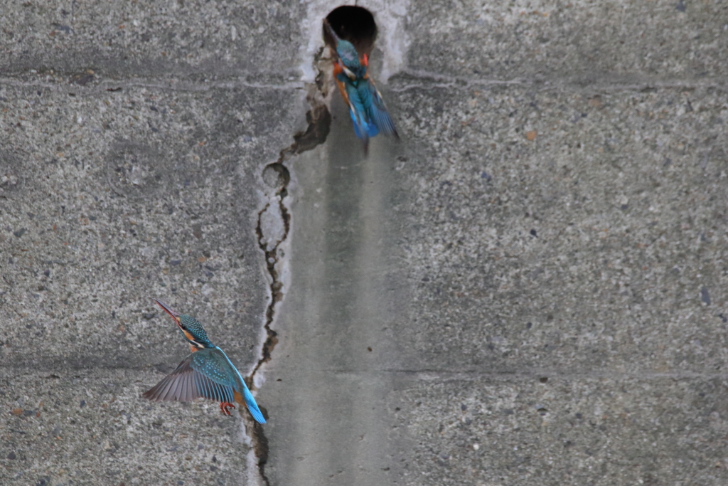 園外に出たカワセミを追って移動した所、2羽で排水管に出入りしてました。1週間前とは打って変わって同棲レベルのペアになってたようです。