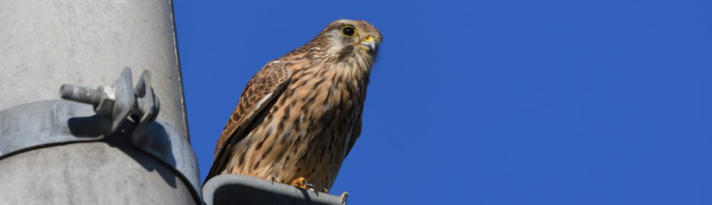 暫くしてチョゲ美『チョウゲンボウ♀』が戻ってきて、少し離れた所に止まったので向かいます。