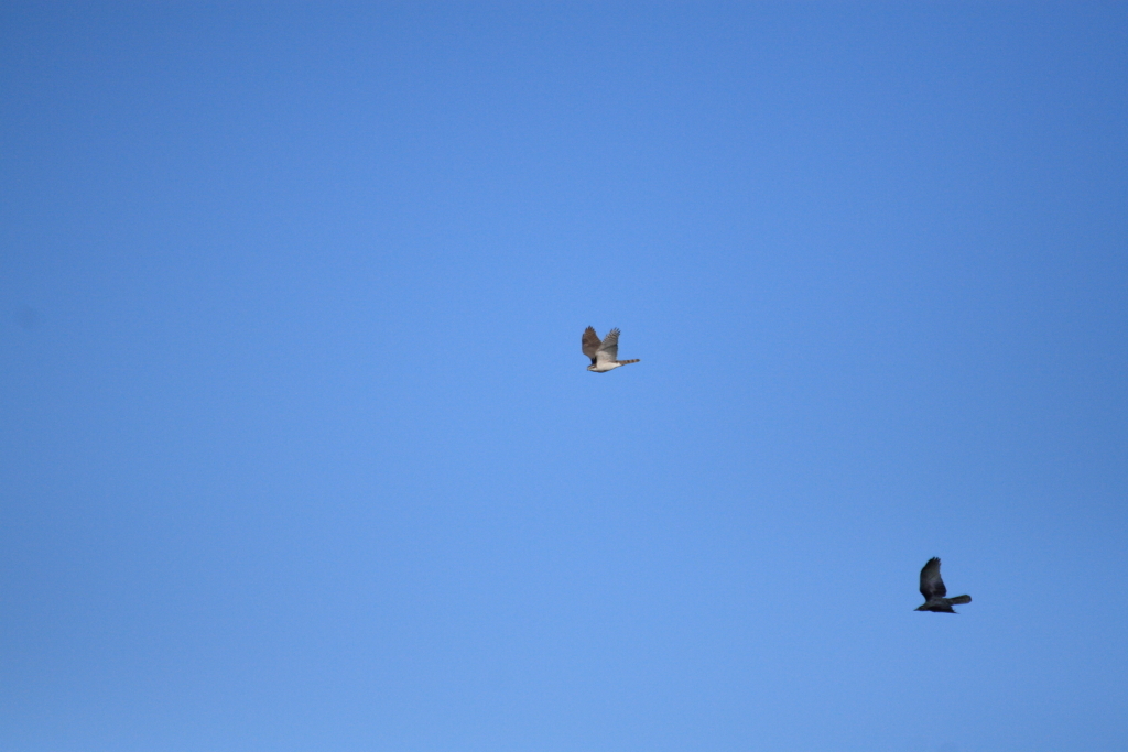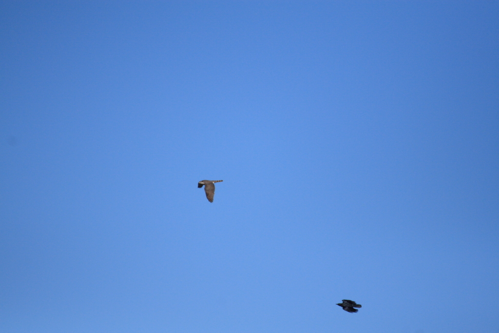 相変わらずの射程距離外ですがカラスのモビングを受けている猛禽を撮ってみます。