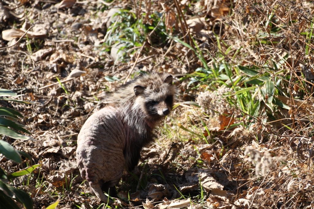 初『タヌキ』ワンショットモードで撮影。首から下の毛が全て抜け落ちていました。ネットで調べたところ『疥癬(かいせん)』という病気みたい…内容は割愛します。『またな。』