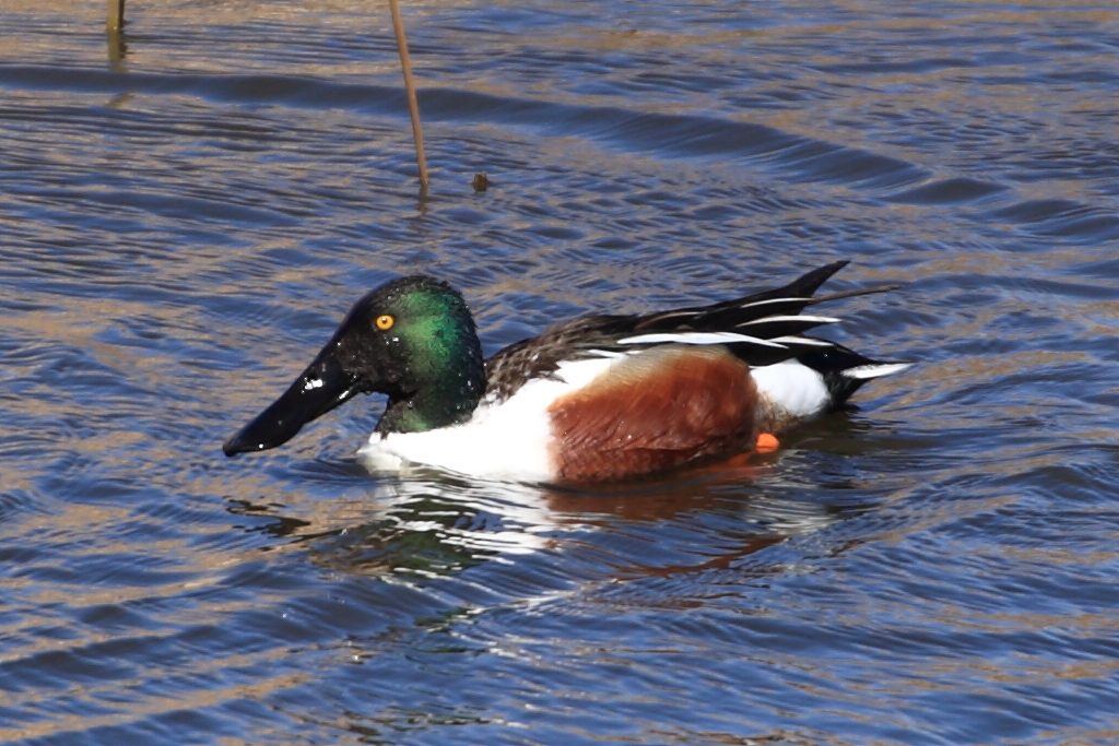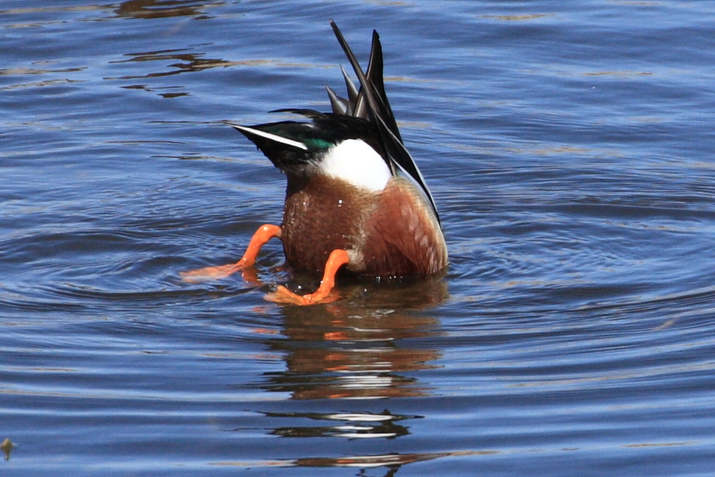 スケキヨごっこ中採餌中の当blog初登場『ハシビロガモ』。お尻フリフリ、足フヨフヨと愛嬌たっぷりの御姿です。