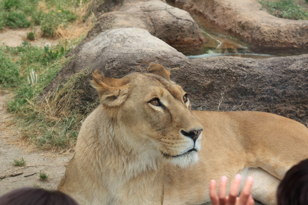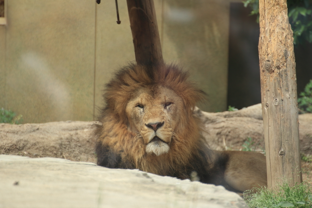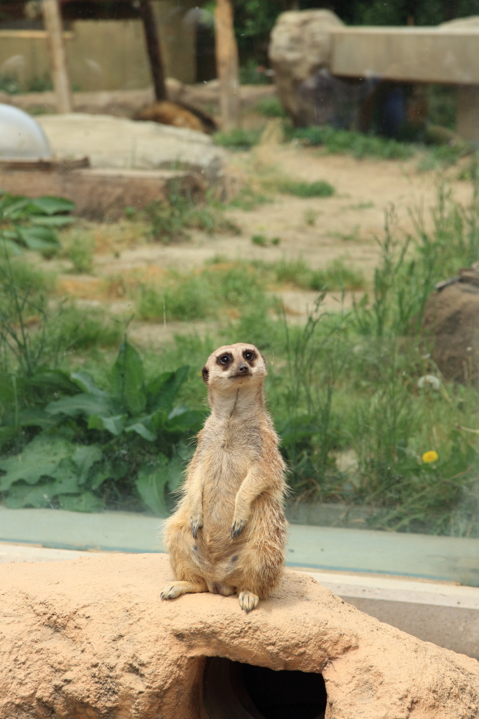 『ミーアキャット』。ミーアキャットの後ろがガラス張りになっていてライオンの展示をしていますが…ライオン達は暑いのか眠いのか興味を示さず思い思いに寝転がってました。
