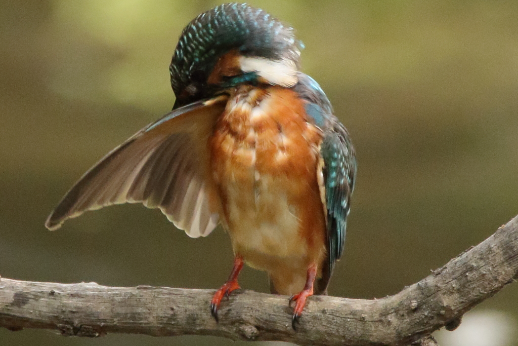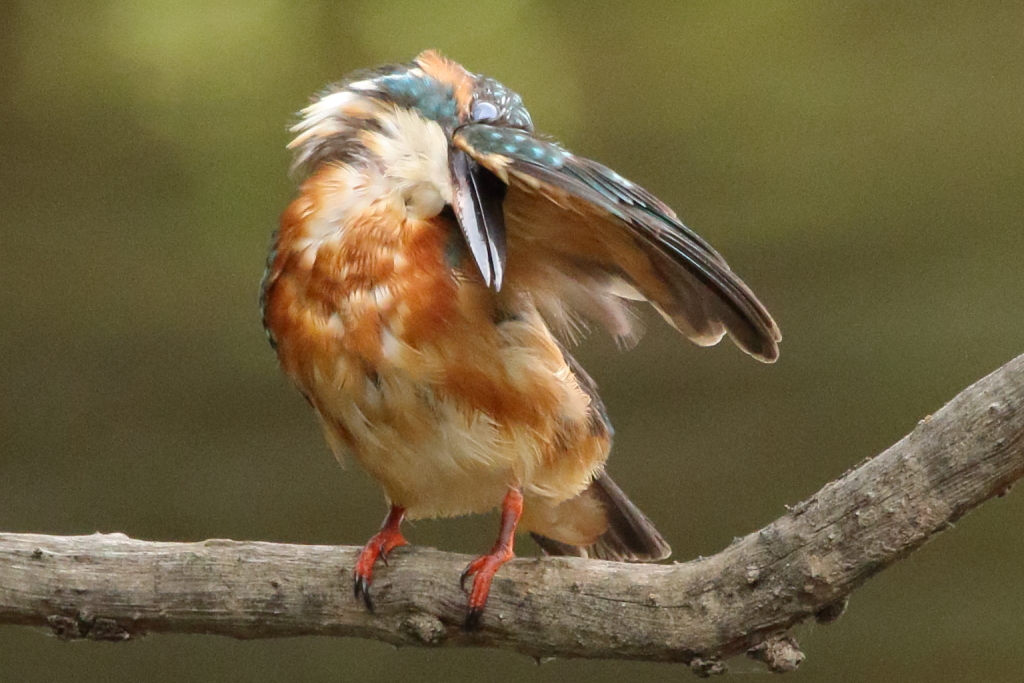 頭を羽で掻いてます。猛禽は足で掻いてましたが、カワセミは短足が過ぎるようです。