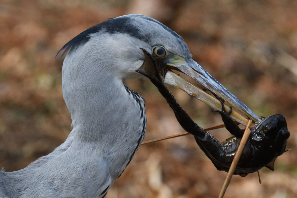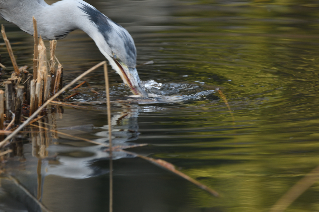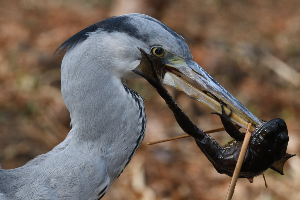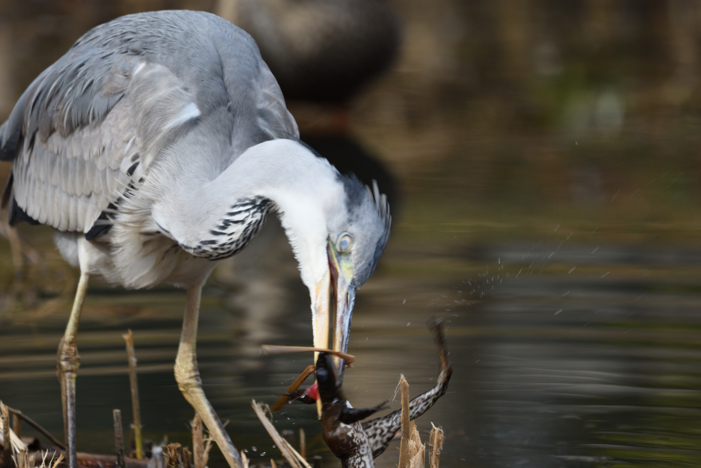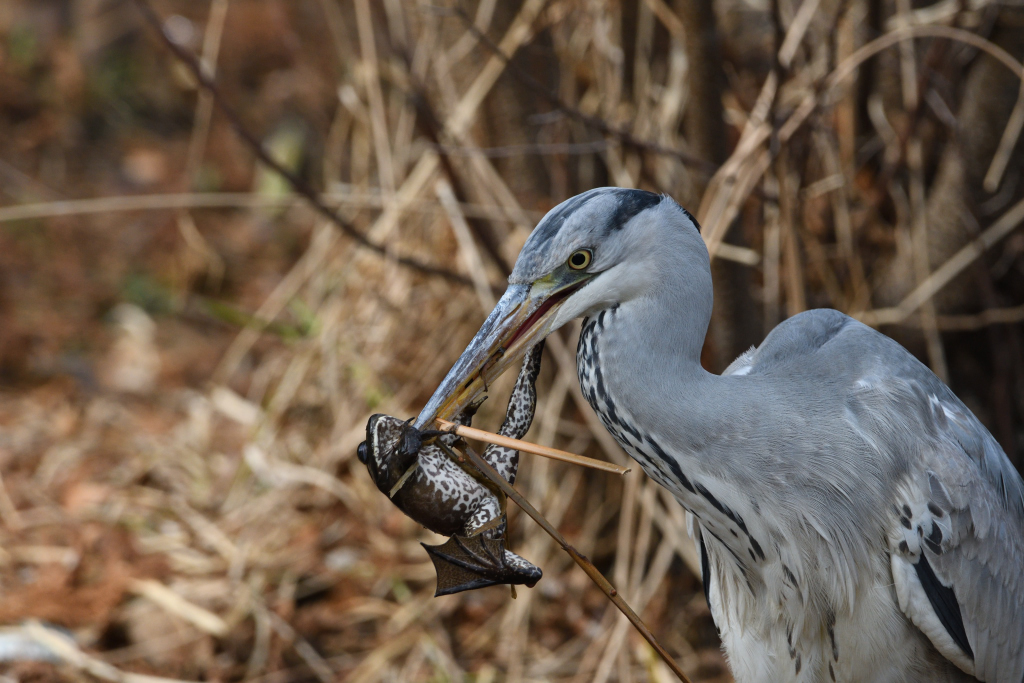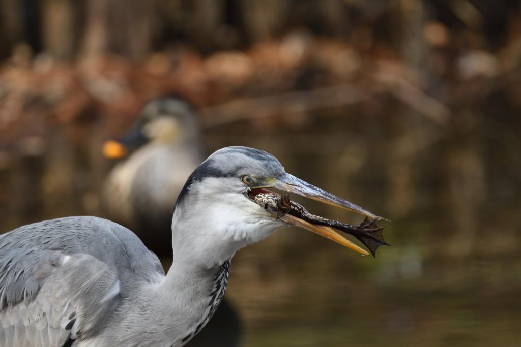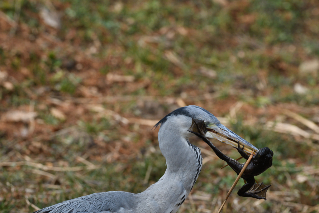 で、いきなりの捕食シーンですがウシガエルでしょうか?必死に抵抗し足がアオサギの眼に!!