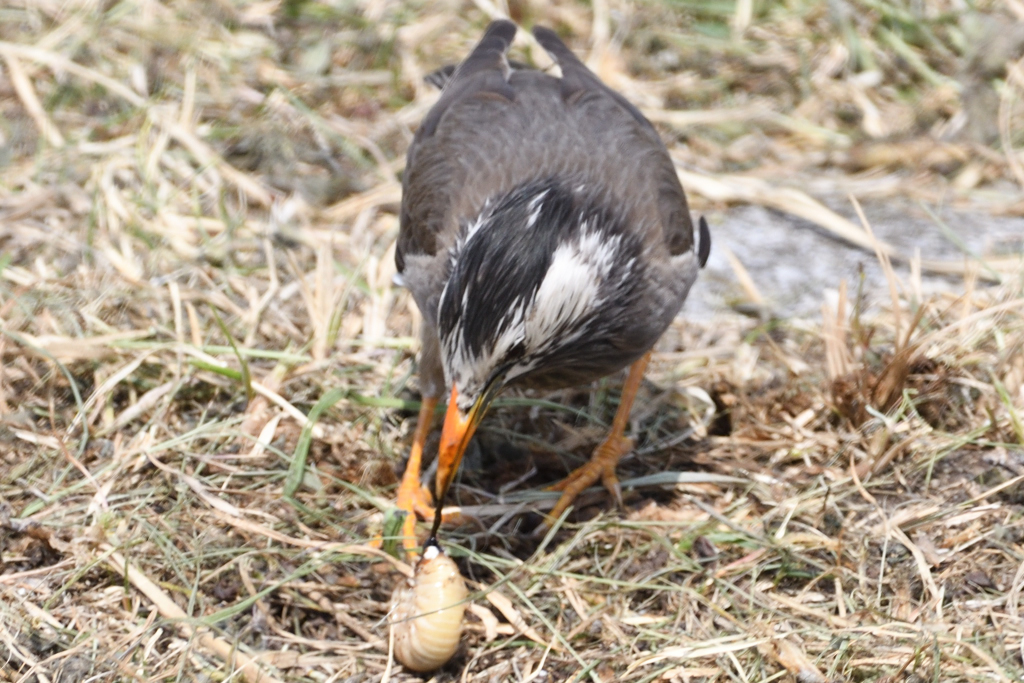 これはムクドリより獲物の方に関心が。甲虫の幼虫ですが都内では珍しくなったカブトやクワガタだったらと思うと…非常に勿体ない気もしますが自然の摂理で仕方がない。