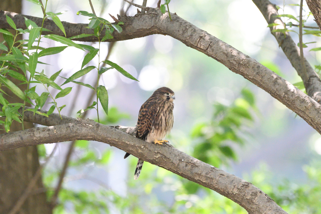 再び地上付近の木に止まる『チョウゲンボウ』幼鳥から。