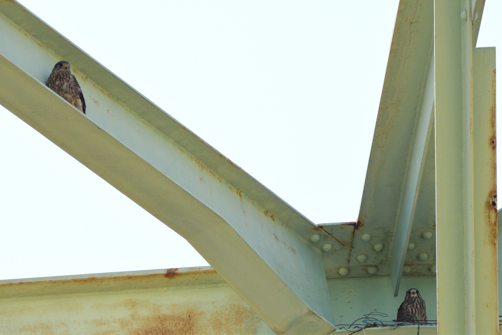 こちらは、巣の近くで鉄橋の縁を歩いて移動する幼鳥。最初の巣は手狭になった為、近くの元カラスの巣を新しい家にしてるようです。