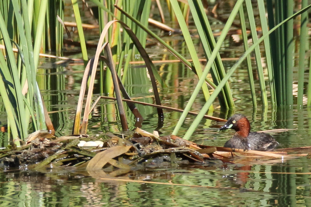 地上ではここのところ天気が大荒れだった為、ダメージを受けた浮き巣のリフォームを行う『カイツブリ』。巣の中には卵が3個確認できます。猛禽に狙われそうではありますがここ2週間ほどここに巣を張ってます。