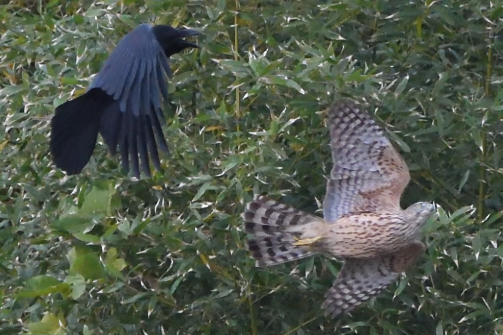 獲物を横取りしようと『カラス』が飛来するも、オオタカが追い払います。